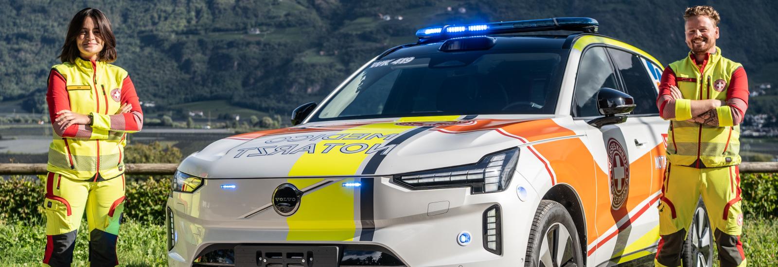 Der Volvo EX90, das Flaggschiff-Modell des schwedischen Herstellers, eignet sich aufgrund seiner Größe (Länge 5.003 mm und Radstand 2.985 mm), seiner Reichweite und der hohen Sicherheitsstandards optimal als Notarzteinsatzfahrzeug. Auch bei den Materialien setzt das Einsatzfahrzeug auf innovative und umweltfreundliche Lösungen: Das Auto besteht zu 15 % aus recyceltem Stahl, zu 25 % aus recyceltem Aluminium, zu 48 kg aus recyceltem Kunststoff und zu 48 kg aus biobasierten Materialien. „Unsere Tests haben gezeigt, dass das Fahrzeug die Modelle mit Verbrennermotor im Einsatz vollwertig ersetzen kann – mit dem Vorteil, emissionsfrei unterwegs zu sein“, erklärt Schmid.