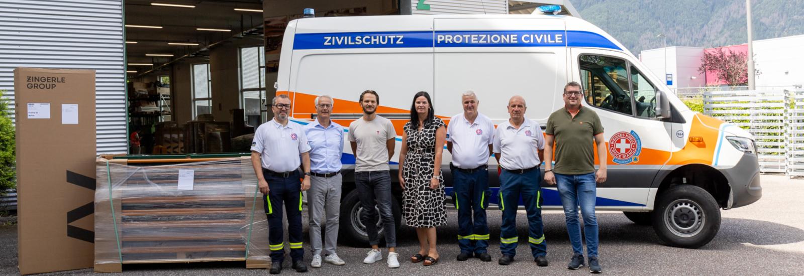 Foto (von links): Markus Leimegger (Leiter Zivilschutz WK), Ivo Bonamico (Direktor WK), Stefan Zingerle (CSO und Mitglied der Geschäftsleitung Zingerle Group), Barbara Petrouschek (Country Sales Manager Zingerle Group), Mathias Franz Chizzali (Freiwilliger Zivilschutz), Herbert Pramsohler (Freiwilliger Zivilschutz), Sandro Gallonetto (Vorstandsmitglied WK).