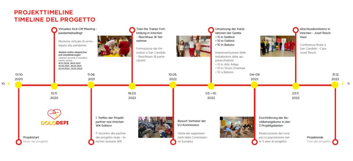Das Grenzgebiet zwischen Südtirol, der Provinz Belluno und Osttirol sind seit jeher ein beliebtes Freizeit- und Wanderziel sowohl für Einheimische als im Besonderen auch für Touristen. Allen drei Projektpartnern ist es ein Herzensanliegen, die Rettungskette im Zusammenhang mit dem plötzlichen Herztod ständig weiter zu optimieren. Der Einsatz von Frühdefibrillatoren ist seit Jahren der Goldstandard im Kampf um das Überleben,wenn ein Herz plötzlich aufhört, zu schlagen. Dazu ist es aber notwendig, ein entsprechend kapillares Netz an Geräten zu haben, samt dem geschulten Personal. Hier gibt es im Grenzgebiet aller drei Partner noch viel zu tun und dieses Projekt soll einen wichtigen Baustein dafür bilden. Kern des Ansinnens ist es, in allen drei Gebieten eine signifikante Menge an Geräten zur Verfügung zu stellen und die entsprechenden Personen zu schulen. Die eingesetzten TrainerInnen werden im Rahmen des Projektes eine gemeinsame Fortbildung besuchen, um den Know-How-Transfer zu ermöglichen. Als letztes Mosaikstück werden die Standorte der Geräte in einer Karte abgebildet, die digital oder in Papierform verfügbar sein wird. Ebenso werden alle Rettungsleitstellen im Grenzgebiet mit den Standortdaten versorgt, so dass ein Notruf unmittelbar einem Gerät zugewiesen werden kann.